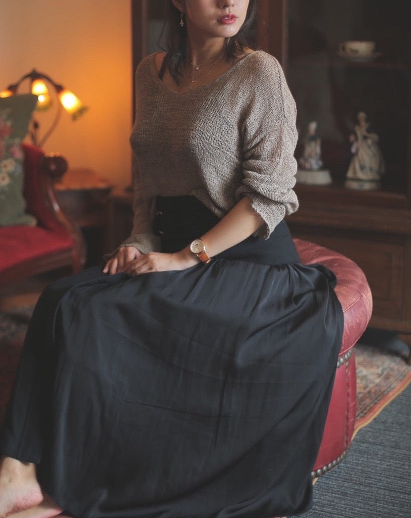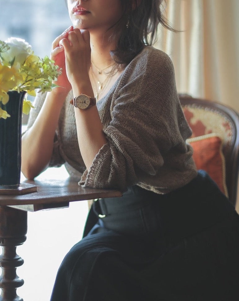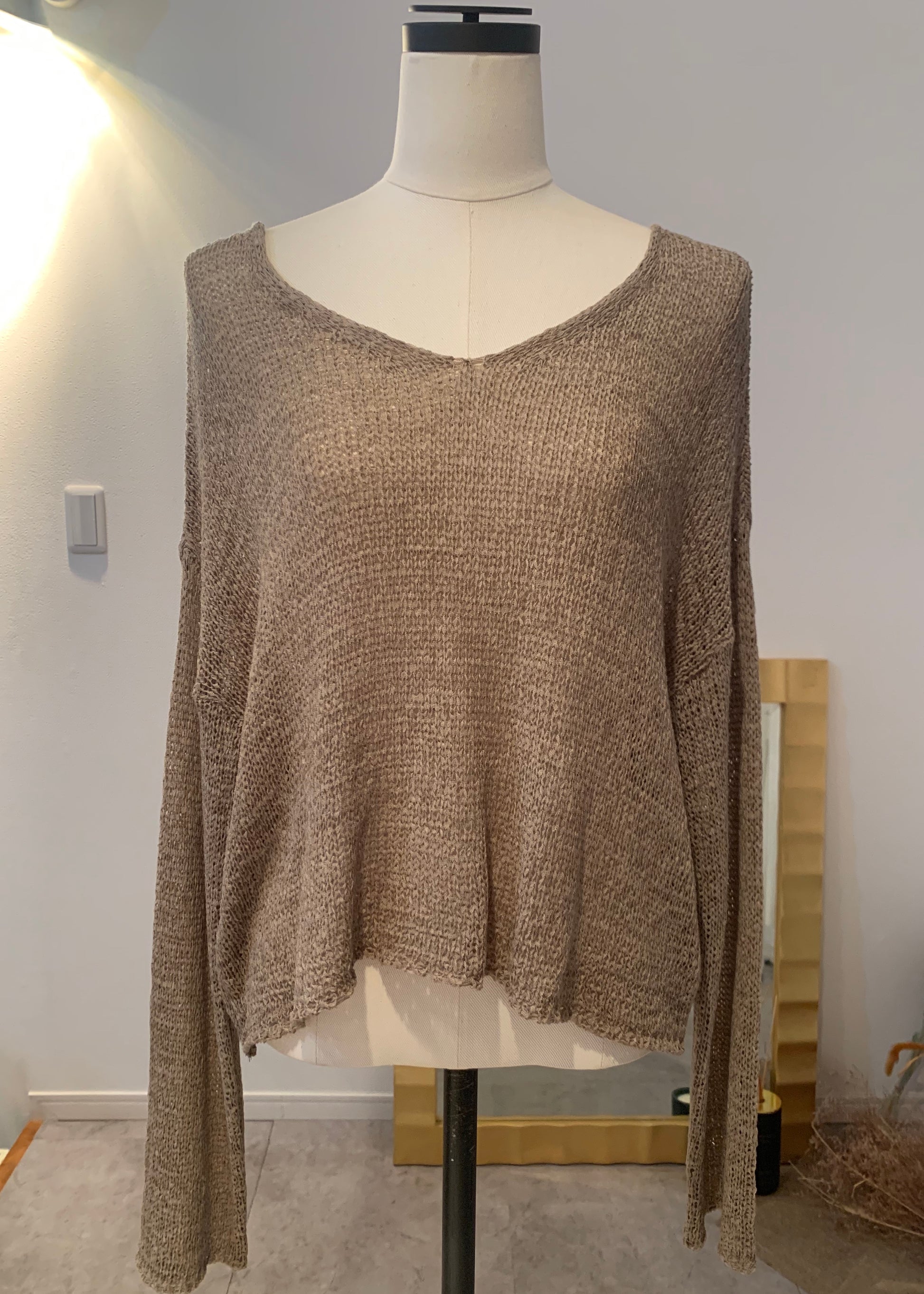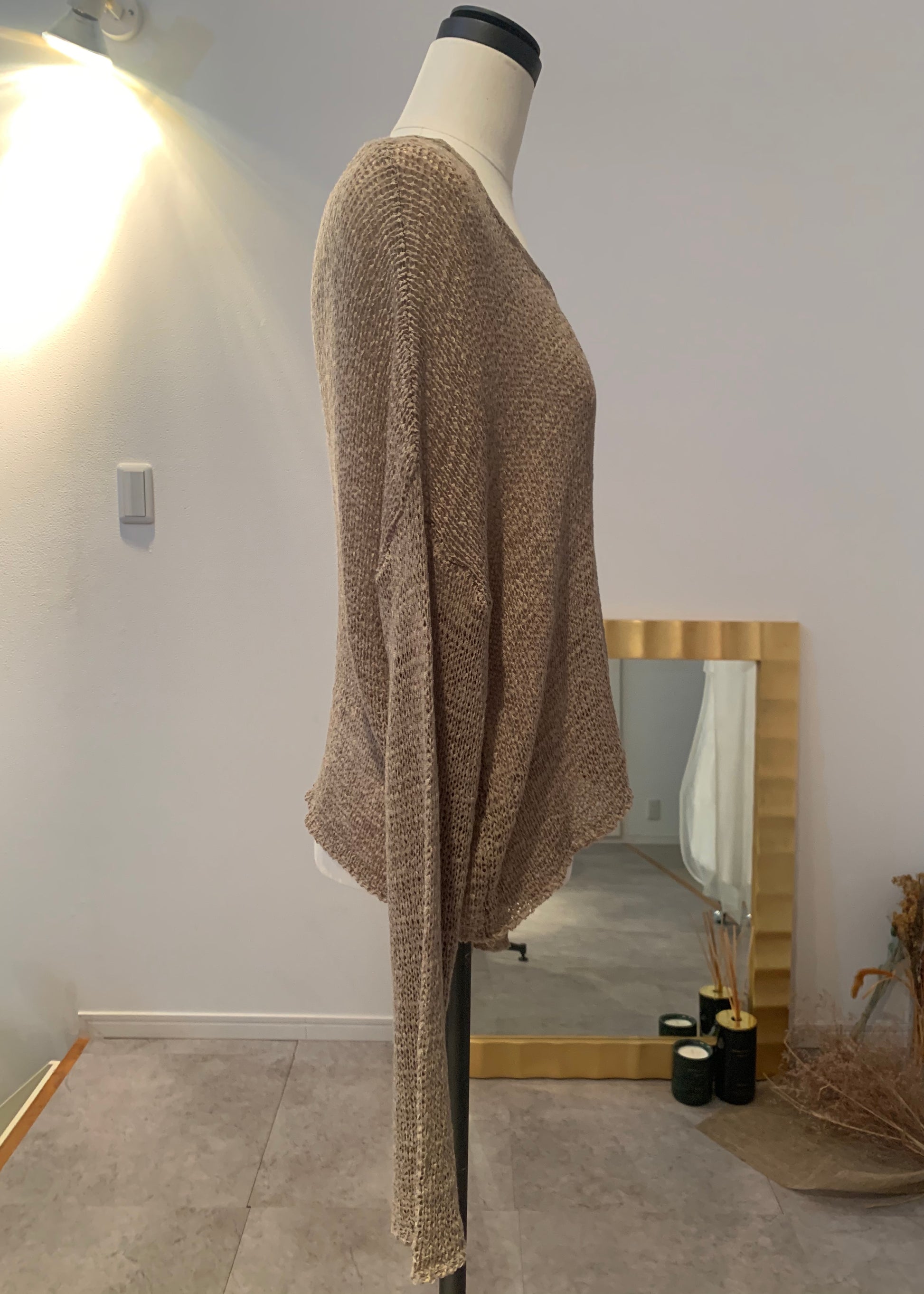薄手でざっくりとした網目が特徴のベージュのニットです。重ね着しやすいので、オールシーズン使い回すことができます。単色ではなく、ベージュと白の混合糸が使用されているため、シンプルでもこなれ感を演出できます。このニットは、さりげなくオシャレを楽しみたい方にぴったりの一着です。さまざまなスタイルに合わせて、おしゃれを楽しんでみてください。